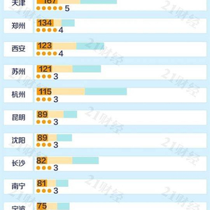 五到十名分别是成都、重庆、南京、天津、郑州,以中南部城市居多。