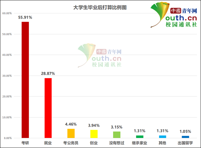 那么,大学生毕业后的去向是什么?调查显示,55.91%的大学生选择考研,28.87%选择直接就业,4.46%选择考公务员,3.94%选择创业,3.15%表示没有想过。
