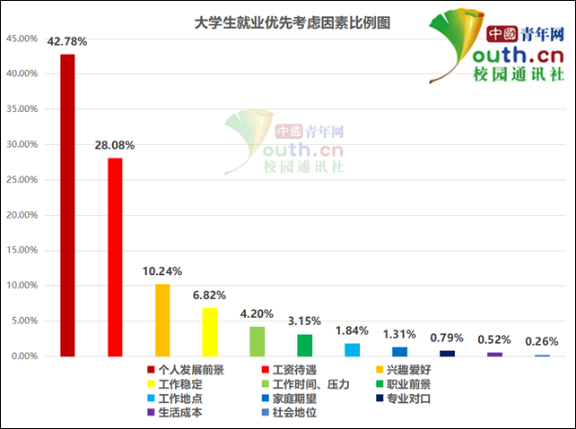 图为大学生就业优先考虑因素比例。中国青年网记者 李华锡 制图