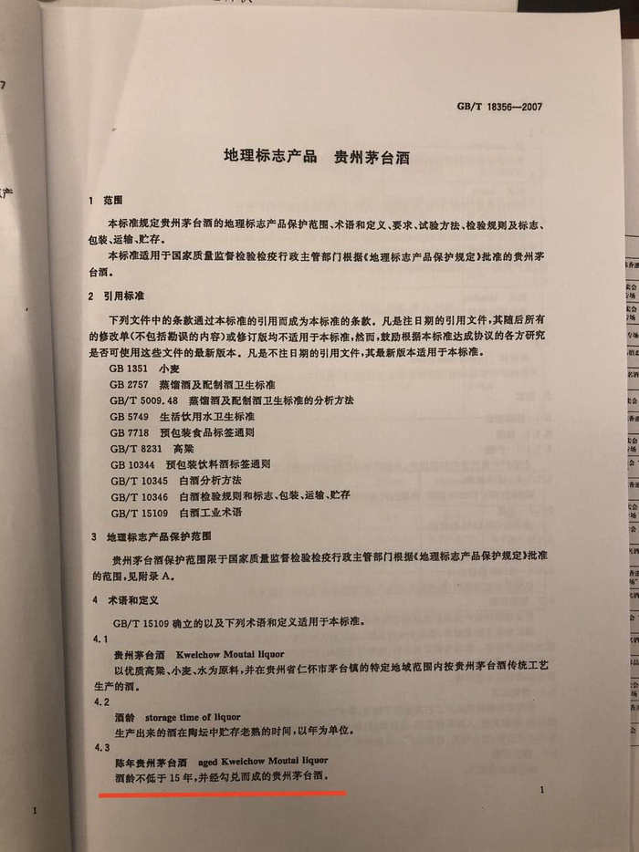 此外,贵州茅台方面还向成都高新技术产业开发区人民法院提供了“国家标准GB\/T《地理标志产品 贵州茅台酒》”。 根据其4.3条定义,陈年贵州茅台酒为“酒龄不低于15年,并经勾兑而成的贵州茅台酒”。其4.7条定义,“勾兑指的是用不同典型体、不同轮次、不同酒精度、不同酒龄的基酒以一定比例组合调制成成品的工艺过程,不添加任何外来物质”。