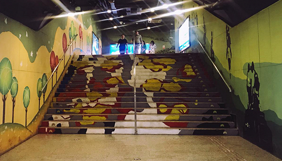 烈士墓站一定是重庆最漂亮的轨道站,涂鸦面积达5000㎡,室内涂鸦面积全国第一。整个车站采用了版画和皮影戏的手法,使人置身于斑斓色彩之中。