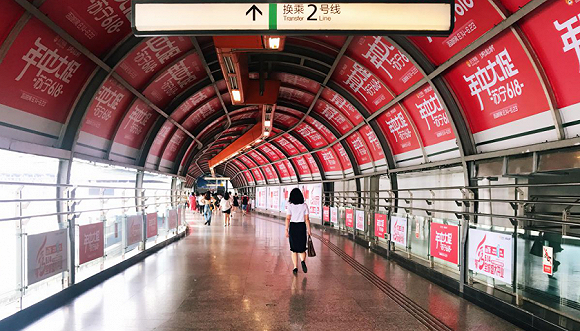 牛角沱站的换乘隧道也不能错过,它架在重庆轨道交通二号线与三号线之间,旁边便是粼粼江面。换乘的人们从隧道里走过,仿佛穿过一条彩色的时空隧道。