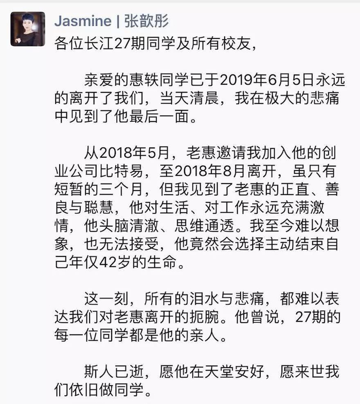 猎云网近日获悉,数字货币市场分析公司比特易创始人惠轶于2019年6月5日逝世,其前比特易合伙人张歆彤在“长江EMABA27官群”发文证实上述信息。张歆彤还说,当天清晨,其在极大的悲痛中见了惠轶最后一面。