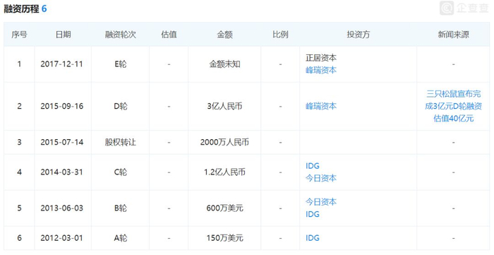 三只松鼠是峰瑞资本创始人李丰的得意之作,其主导了IDG对三只松鼠前三轮全部投入,而李丰自立门户之后成立了峰瑞资本,仍坚定不移的继续投入最后2轮。