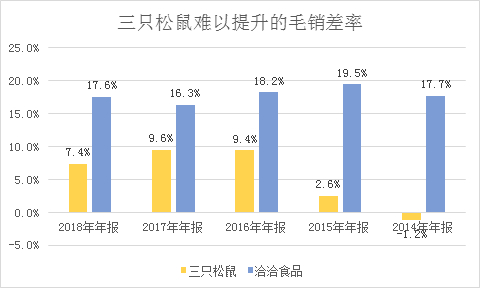 最终产生的结果则是,在极其相似的毛利率水平下,三只松鼠的毛销差(毛销差=销售价格-原料成本价格-销售费用)仅为洽洽食品的一半。也就是说,在扣除成本和销售费用之后,三只松鼠只能实现7.4%的毛销差。