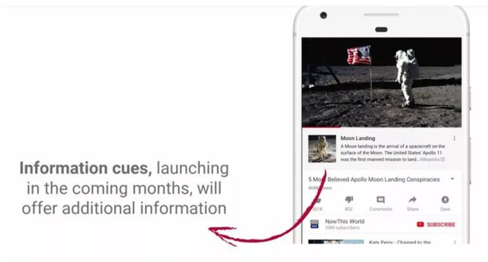 谷歌还在 YouTube 的某些视频下,放上引到维基百科的链接,告知视频是关于某个正进行的新闻动态、历史事件(比如 9/11 恐怖袭击)或来自某国的官方媒体,或得到政府资助等。[3]