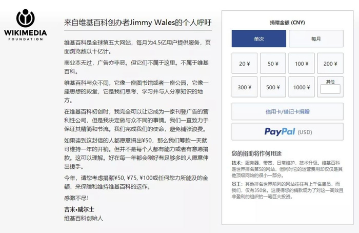 据官方介绍 [1] ,维基百科是全球第五大网站,每月为 4.5 亿用户提供服务,页面浏览数以十亿计。不过该网站只有 350 名全职员工,它们通过强调运营的高效率和非营利性向捐助者证明其付出物有所值。