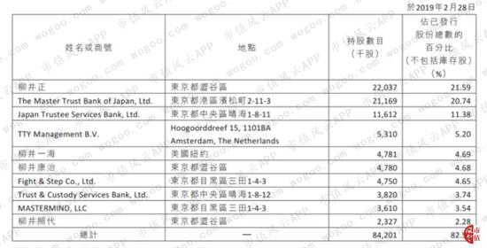 根据此前公告,柳井正除直接持股21.59%外,同时通过其持有100%股权的 TTY Management B.V.间接持有迅销5.20%的股权。