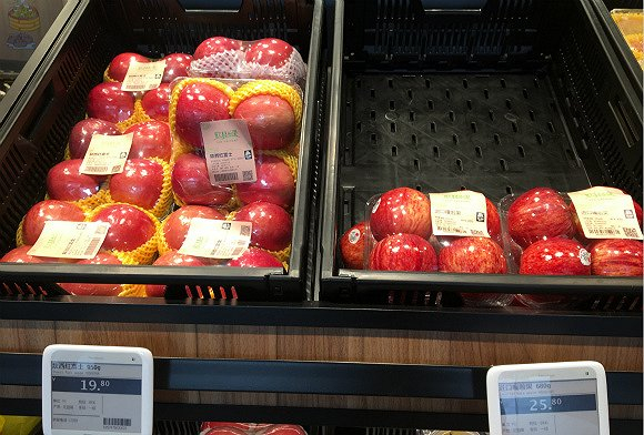 门店入口处最显眼的位置留给了蔬菜瓜果等生鲜产品,有来自中国本土的,也有从海外进口的。售货员告诉界面新闻,相对而言消费者更青睐进口水果。以苹果为例,相邻的陕西苹果和新西兰苹果相比,后者更热销,筐子已经空了大半。