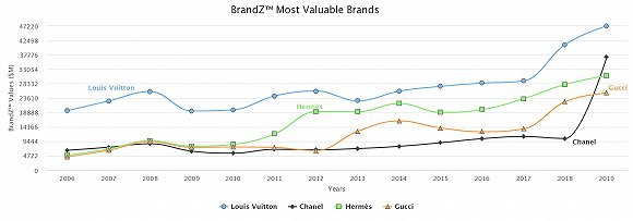 在这样的评价体系下,Louis Vuitton在2019年的品牌估值达到472亿美元,较2018年411亿美元的估值再上升15%。