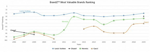根据相关榜单数据,奢侈品牌们加强电商发展和数字化营销的策略,使得它们的品牌价值均有大幅提高。