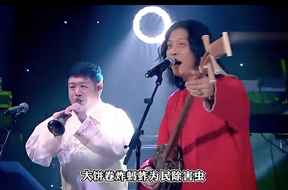 以方言唱歌:北方的曲艺风格,南方的地区意识有关地方饮食的歌曲是方言歌曲中一个不错的范例。天津岩石乐队主唱李亮节的《大饼卷一切》唱的是天津卫的大饼,歌词繁复地铺陈了大饼的内容及其味道,比如“大饼卷鸡蛋好吃又好看/大饼果子配豆浆它味道特别浓/大饼卷炖牛肉怎么吃都吃不腻”,最富有文学修辞性和想象力的是“大饼卷素丸子它架炮往里轰”,以及将大饼的味道形容为“酸甜苦辣咸/鲜香麻酥脆/卷的是人生百味/尽在不言中”。在《乐队的夏天》节目中,熊猫眼乐队的《我爱吃烤鸭》以北京腔咏唱了北京烤鸭的吃法——“一张饼卷一只鸭”“加点葱再加点黄瓜”,相比于《大饼卷一切》而言较为简洁。