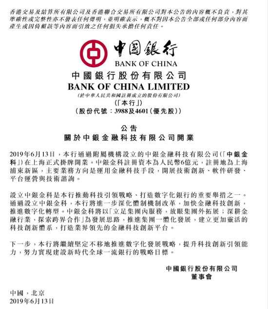 新浪财经讯 6月13日,中国银行在港交所发布公告称,中银金融科技有限公司在上海正式挂牌开业。中银金科注册资本为人民币6亿元,注册地为上海浦东新区,主要业务方向是运用金融科技手段,开展技术创新、软件研发、平台运营与技术咨询。