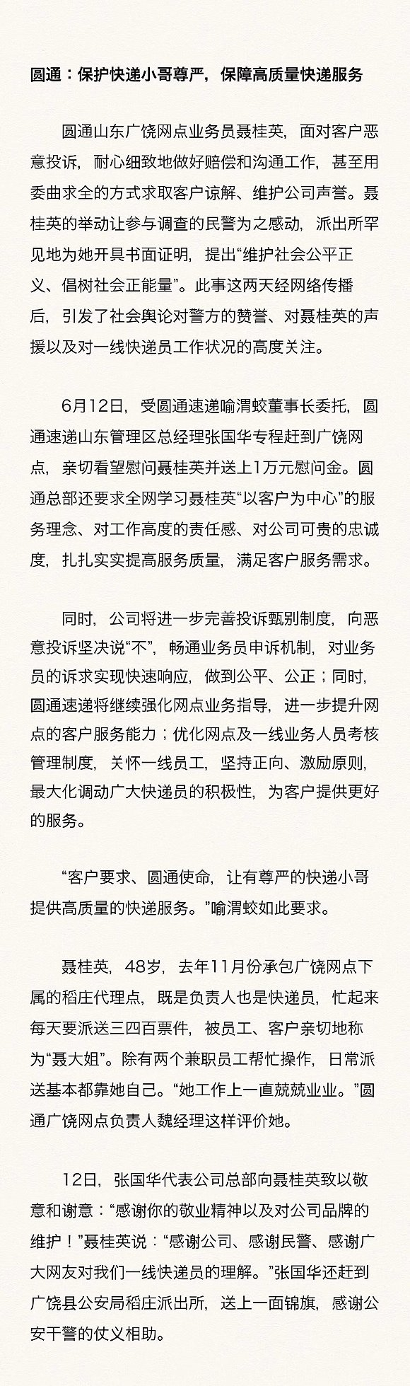 6月12日深夜,圆通速递官方公开就山东广饶一48岁女快递员遭投诉后下跪事件再次作出回应,圆通山东管理区总经理已为聂桂英送上1万元慰问金,并要求全网学习聂桂英的服务理念。与此同时,圆通速递还表示,将进一步完善投诉甄别制度,强化网点业务指导,优化考核制度。