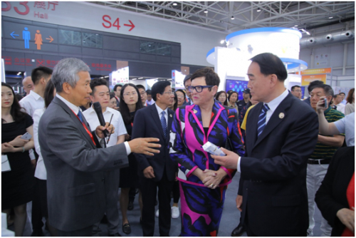 图注:伊利展台前,伊利集团总裁助理云战友博士为大会领导介绍伊利舒化无乳糖牛奶