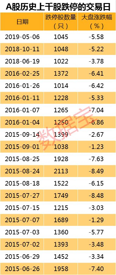 数据宝统计显示,剔除ST板块后,A股历史上合计出现过20次千股跌停,全部发生在5178点以来的调整中。其中,最近一次是今年的5月6日,当日大盘下跌5.58%,跌停个股数量达到1045只。整体来看,千股跌停交易日中有12次发生在2015年,5次发生在2016年,两次发生在2018年。跌停股数最多的一次出现在2015年8月24日,当天沪指大跌8.49%,创业板指、中小板指分别大跌8.08%、7.71%,有2100多只股票跌停,这是A股历史上首次出现超过2000只股票跌停。