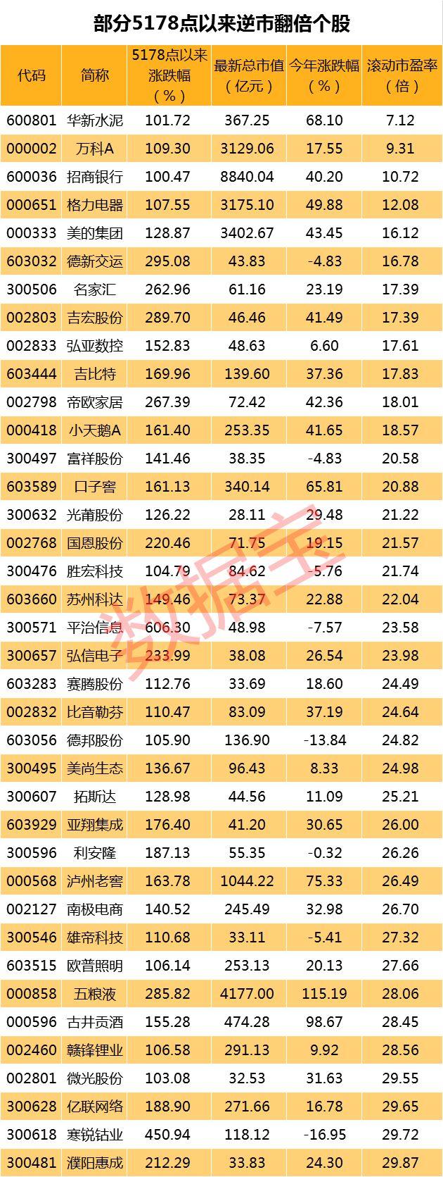 在逆市翻倍股当中,还有12只个股市盈率不足20倍。其中,5178点以来大涨近102%的华新水泥,最新滚动市盈率不足8倍榜单最低;逆市上涨超109%的万科A市盈率9.31倍位居榜单次席;涨超100%的招商银行,市盈率不足11倍位居榜单第三位。
