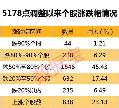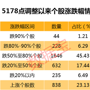 本轮调整跌幅超90%个股数量及占比均超过6124点时期,但腰斩个股数量占比较少。数据显示,本轮调整有1918只股票至今跌超50%,占比达到52.94%。6124点时期,有1302只股票跌超50%,占比83.25%。