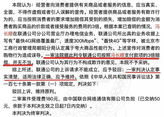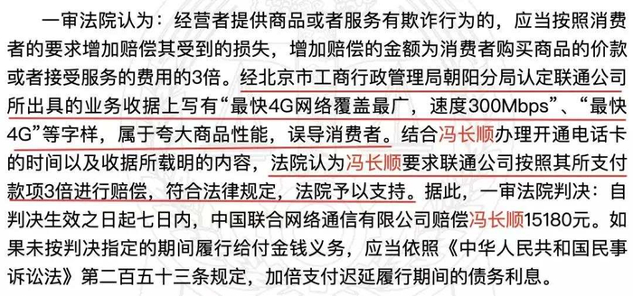 2018年12月,认为自己被欺诈的冯长顺将中国联通告上了法院,请求法院法院依据《消费者权益保护法》判令联通公司给予三倍赔偿。