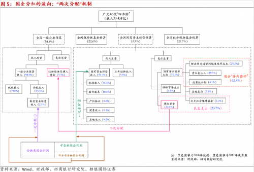 首先,从国有资产管理的体制上,我国将金融类国企和非金融类国企(即实业类国企)区分开来,金融国有资产由财政部管理,实业国有资产由国资委管理。与此相应,从国企向财政分红的流向看,也形成两股资金上解的路径:金融类国企的分红直接进入“一般公共预算”;实业类国企的分红进入单列的“国有资本经营预算”,其中部分再由“调出资金”的方式流向“一般公共预算”。这样一来,就形成了我们称之为“两次分配”的国企分红机制(图5)。
