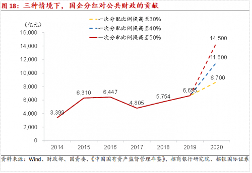 假设2020年国企(金融类+实业类)归属国有母公司的净利润达到3.75万亿元(金融类国企2万亿元,实业类国企1.8万亿元),按照“一次分配”30%、40%、50%的三种情景,“二次分配”按50%测算,估计公共财政将分别获得到8,700、11,600、14,500亿元的支持,国企分红将对公共财政做出更大的贡献(图18)。