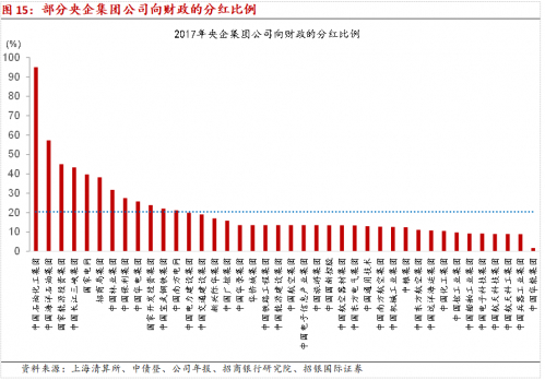 央企下属上市公司以36%的分红率向央企集团公司分红,那么,央企集团公司以多大比例向国家上缴分红呢?为说明这一问题,我们选取了97家央企中因公开发债而向市场披露财务数据的59家为研究样本。2017年度,40家有向财政分红,10家无分红,9家负分红(补贴)。以40家有向国家分红的央企集团公司计算,平均分红率为20%(图15)。