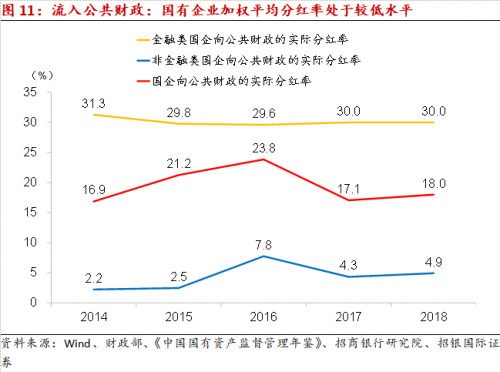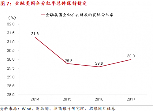 我们再来测算金融类国企向财政的分红率。由于金融类国企归属全民股东的净利润数据不可得,我们选取财政部和中央汇金公司直接持股的14家A股上市金融机构包括工商银行、建设银行、中国银行、农业银行、交通银行、光大银行、中信银行、浦发银行、平安银行、申万宏源、中国平安、中国人寿、中国太保、新华保险。作为样本,根据年报数据加权计算国有金融机构的分红率,以此替代我国金融类国企的分红率。据此,2017年金融类国企的分红率为30%(图7)。当然这个分红率也可能夸大了实际的分红率水平,一个佐证是财政部长刘昆在去年10月向人大常委报告金融企业国有资产管理情况时,指出中央国有金融企业“2017年平均分红比率28.9%,较2013年提高2.8个百分点”。