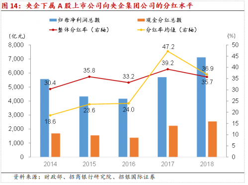 我们搜集了国资委管理的中央企业下属A股上市公司的公开数据,发现分红率并不算低,而且呈上升趋势(图14)。2018年央企下属上市公司整体分红率水平35.7%,分红率均值为36.9%。