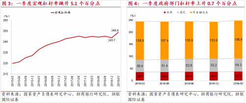 如此背景下,各级政府面临极大的财政压力,拓展资金来源也就成为当下财政最为迫切的需求。政府只能通过发债加杠杆的方式筹措资金,随着今年逆周期政策发力,一季度的宏观杠杆率环比上升5.1个百分点至248.8%,使得近两年受到抑制的宏观杠杆率再度攀升,创下新高(图3),其中政府部门杠杆率同比上升1.9个百分点,环比上升0.7个百分点(图4)。可见,政府通过大规模发债或借融资平台继续加杠杆筹资,虽然可以在一定程度上缓解财政压力,但无疑将进一步加大宏观债务风险。相较之下,盘活资金存量,优化资金配置显然是更为稳妥的方式。