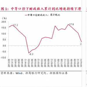 下调增值税税率会对一般公共预算收入的增长形成一定拖累增值税收入多年来一直占到我国税收收入的四成左右,而税收收入又占到一般公共预算收入的八成左右,因此,作为今年财政政策的“主菜”,下调增值税率将会对一般公共预算收入的增长形成拖累。下调社保费率会对社会保险基金预算收入产生负面影响受老龄化加速影响,我国社会保险基金预算收入增收难度越来越大,需要其他“账本”对其进行持续“输血”。随着房地产调控政策的持续,土地出让收入增长放缓,已经导致政府性基金预算收入增速较去年有较大幅度的下滑2018年,政府性基金预算收入累计增速达到22.6%。但今年一季度增速却大幅下滑至-9.5%,如果房地产调控政策持续从紧,那么政府性基金预算收入增速预计将会进一步下滑。
