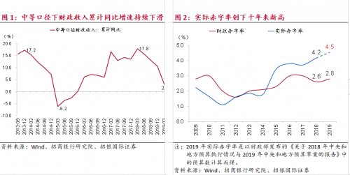 今年我国采取了较为积极进取的财政政策,近两万亿的“减税降费”使得各级财政收支面临很大的平衡压力。中等口径下的财政收入(一般公共预算收入+政府性基金收入)累计同比增速从去年开始持续下滑,到今年四月增速更是降至2.9%,创下2016年以来的新低(图1)。而且,叠加经济增速的放缓,财政收入下行的趋势可能还将持续下去。收入下滑而开支加大,财政预算的赤字率被迫进一步上调至2.8%,预计实际赤字率实际赤字率=(一般公共预算支出-一般公共预算收入)/名义GDP升高至4.5%,达到十年来新高(图2)。