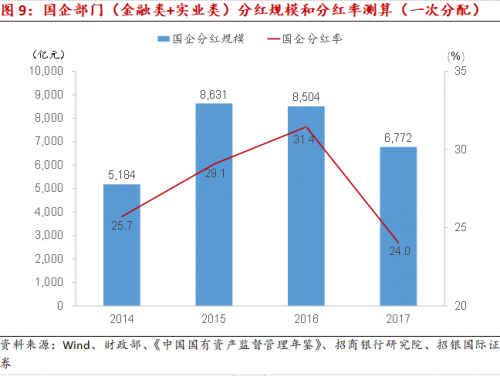 最后,我们将金融类和实业类国企合并起来观察整个国企部门分红的全景。从国企部门向广义财政“一次分配”的角度,可以估算出整个国企部门向国家上缴利润的总规模,2017年为6,772亿元,分红率为24%(图9)。