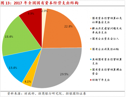 2012年以来,该比例总体呈现上升趋势,2018年调出资金的占比已达26%,2019年预算中达到29%,到明年实现30%的目标几乎没有难度(图12)。然而,按照目前实业类国企“一次分配”分红率约20%,再按“二次分配”的30%上缴公共财政,实际分红率仅为6%。这一改革目标无异于“问道于盲”。没有“一次分配”比例的提高,“二次分配”就成了无源之水、无本之木。
