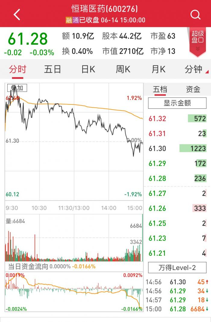 翰森制药股价高开14.31%,一路上涨,午后涨幅进一步扩大,最高涨近49%,此后有所收窄。截至6月14日收盘,翰森制药涨36.75%,报价19.5港元,市值1113亿港元,成为港股最大市值的医药股。另外,千亿市值医药股还有有药明康德1089亿,中国生物制药894亿。