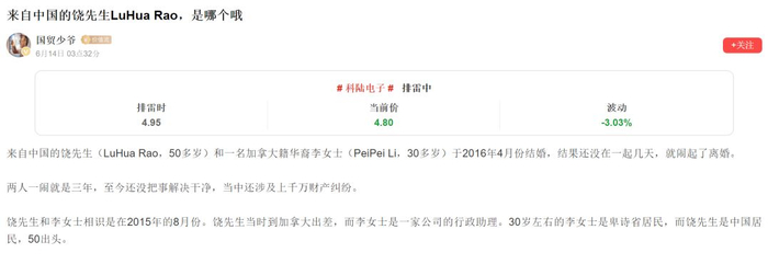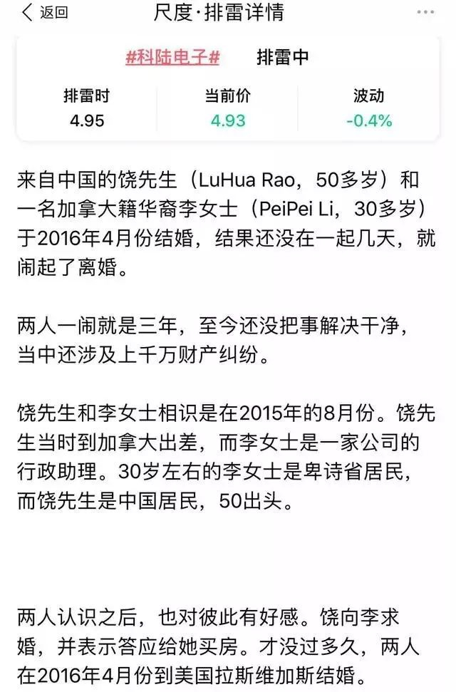 6月14日凌晨,投资者互动社区尺度APP的一位用户发帖称,来自中国的富豪饶(音)先生(Lu Hua Rao)在加拿大涉及一起婚姻案件,帖子被分在尺度APP的“排雷板块”,并与上市公司科陆电子进行了关联,而科陆电子董事长饶陆华与此案件中受到指控的富豪名字读音一致。