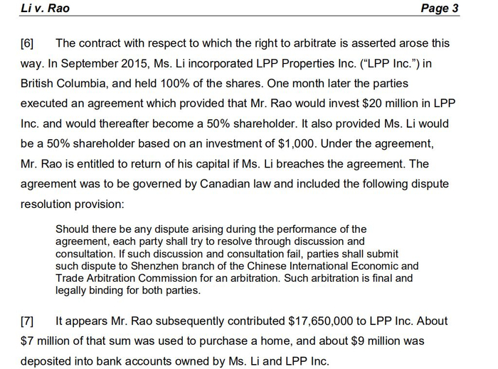 该材料显示,2015年9月,李女士注册了LPP公司,持有100%的股份。一个月后,李女士与饶先生签订了一份协议,协议规定,饶先生向LPP公司投资2000万加元,成为持股50%的股东。协议还规定,李女士投资1000加元,持有另50%的股权。