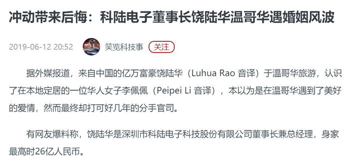 在18亿定增项目流产、计提坏账超2亿、因违规操作收到监管函之后, 科陆电子 (002121)再次被曝猛料:网友质疑科陆电子董事长饶陆华,涉嫌卷入跨国重婚案!