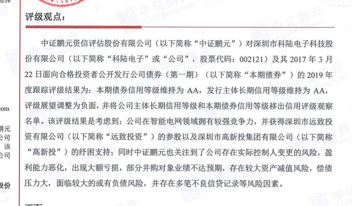 就在前一日,科陆电子发布了2014年公司债券(第一期)2019年跟踪信用评级报告,中证鹏远对科陆电子2014年9月发行的2亿元公司债券进行2019年跟踪评级,结果是,信用等级维持为AA,发行主体长期信用等级维持为AA,但评级展望调整为负面,并将公司主体长期信用等级和本期债券信用等级移出信用评级观察名单。