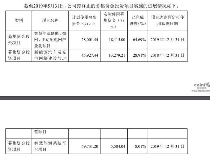 2018年5月,科陆电子发布公告称,公司拟终止实施“110MW地面光伏发电项目”,并将该项目剩余募集资金3.31亿元永久补充流动资金。而截至2019年5月31日,智慧能源储能、微网、主动配电网产业化项目募集资金投资进度为64.69%,新能源汽车及充电网络建设与运营项目投资进度为28.91%,智慧能源系统平台项目的投资进度为8.01%。