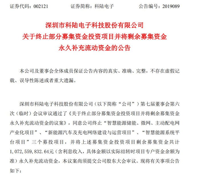 监管风波还未结束,6月13日,科陆电子再次发公告称,拟终止“ 智慧能源 储能、微网、主动配电网产业化项目”“新能源汽车及充电网络建设与运营项目”“智慧能源系统平台项目”三个募投项目,并将剩余募集资金共计约10.73亿元永久补充流动资金。