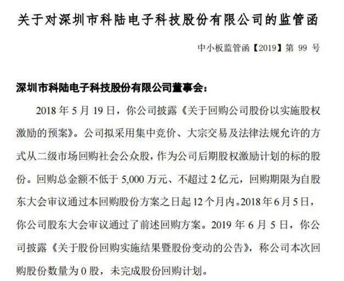 同样是6月12日,科陆电子又收到了深交所下发的监管函。监管函指出,科陆电子的股东大会在2018年6月5日审议通过了《关于回购公司股份以实施股权激励的预案》,但在2019年6月5日却发布回购股份数量为0股、未完成股份回购计划的公告,违反了相关规定。