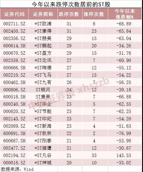 从跌停的数量来看,*ST康得、*ST欧浦今年遭遇31次跌停,*ST赫美、*ST盈方、*ST鹏起以29次跌停紧随其后。