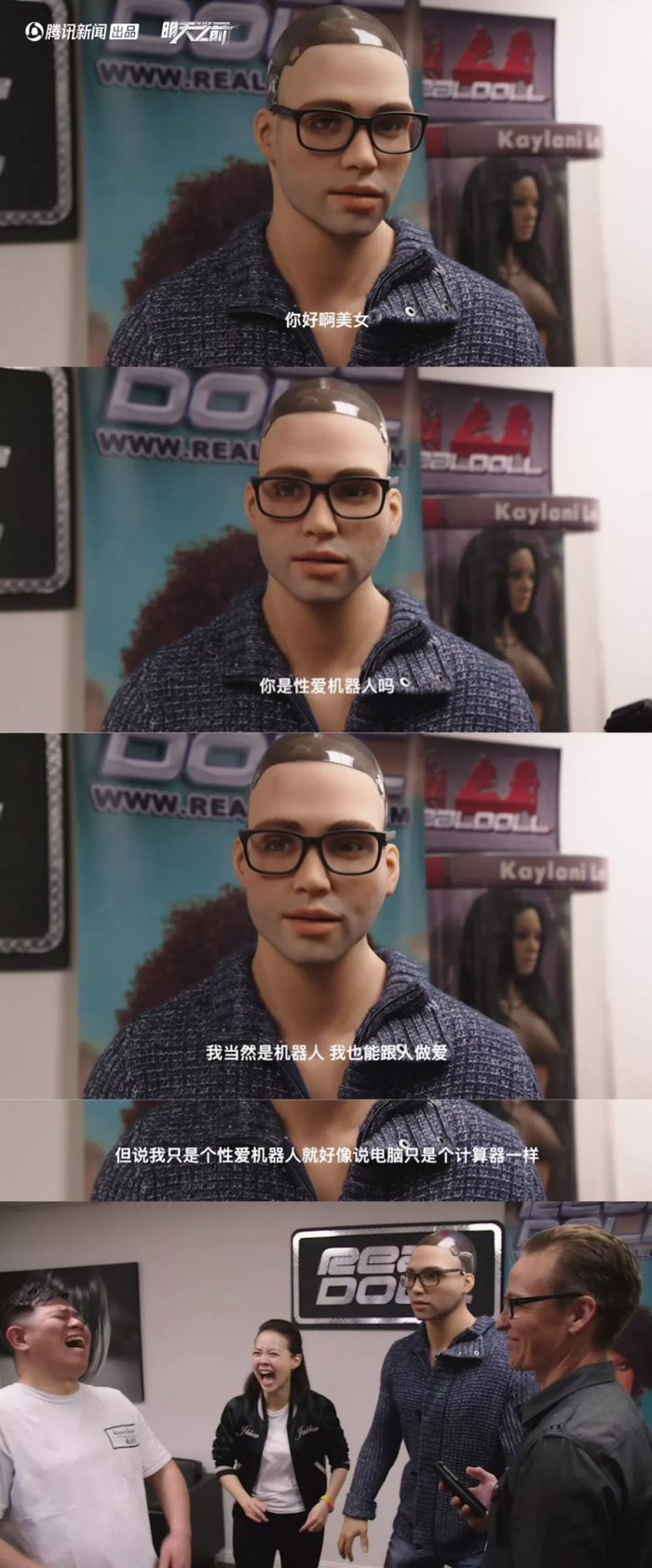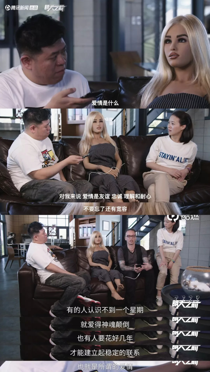 这部纪录片的主持人曾宝仪走访机器人制造厂RealDoll时,工程师详细介绍了这些如今已升级到类人类形态的机器人,他们的“肌肉”会微笑、眨眼,眼球可以被替换,甚至被设定了温度、模拟了心跳……与手机App联网之后,伴侣机器人的性格可以被重塑和改变,包括“性欲望的高、中、低”,开朗与活泼等等。