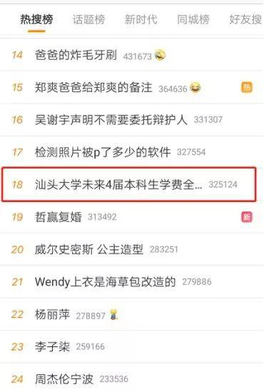 汕头大学免学费的消息刚刚出炉,在高考气氛的加持之下,迅速登上微博热搜榜。而汕头大学公告阅读量也已接近“10万+”。