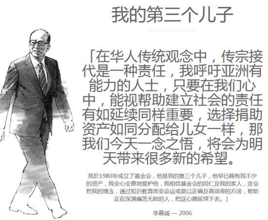 作为李嘉诚的“第三个儿子”,李嘉诚基金会成立于1980年,其使命在于推动社会建立“奉献文化”本质的力量。基金会主要捐款予教育、医疗、文化及其他公益事业。李嘉诚希望透过教育强人力和文化资源,透过医疗项目可建立一个关怀的社会。