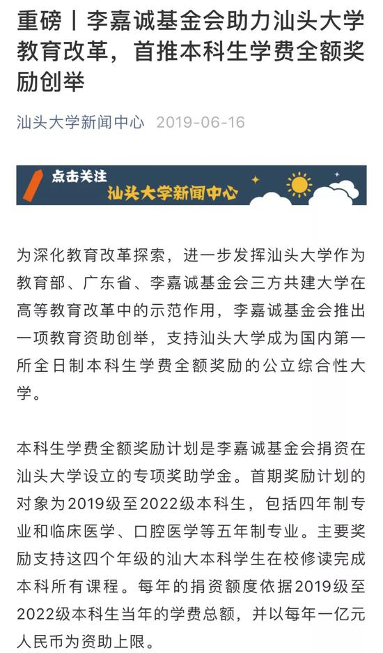 根据汕头大学公告,该次本科生学费全额奖励计划是李嘉诚基金会捐资在汕头大学设立的专项奖助学金。首期奖励计划的对象为2019级至2022级本科生,包括四年制专业和临床医学、口腔医学等五年制专业。