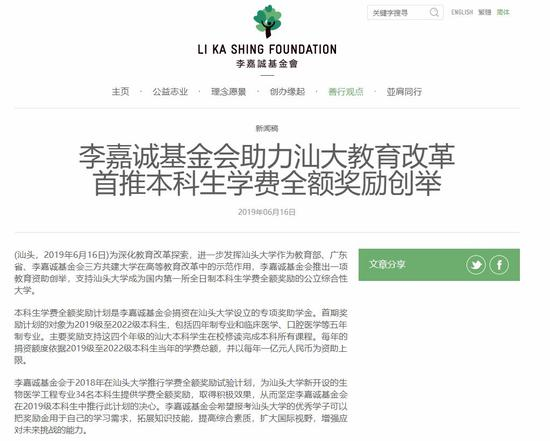 李嘉诚基金会对汕头大学的支持款超过100亿港元。