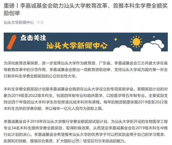 据了解,这项本科生学费全额奖励计划是李嘉诚基金会捐资在汕头大学设立的专项奖助学金,每年的捐资额度依据2019级至2022级本科生当年的学费总额,并以每年一亿元人民币为资助上限。