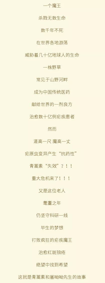 2015年10月,因其发现的青蒿素可以有效降低疟疾患者的死亡率,屠呦呦成为史上首位获得诺贝尔科学奖项的中国本土科学家。在此之后,她并未停止对青蒿素的研究。