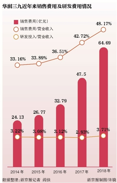 在营收增百亿的这些年中,华润三九曾曝出子公司两度行贿相关人员,而与此同时,上市公司销售费用增长迅猛,由2014年的24.13亿元增至2018年的64.69亿元,五年增40亿,占营收比重也由33.16%升至48.17%,远超行业平均水平(25%左右)。